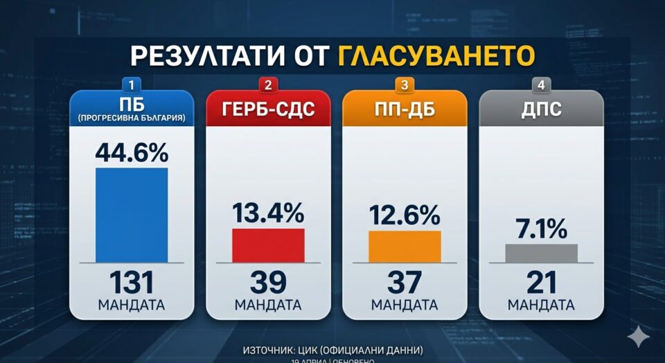 При обработени 100% СИК протоколи в РИК, обобщените данни от гласуването в неделя показват, че за „Прогресивна България“ са гласували 44.594%.