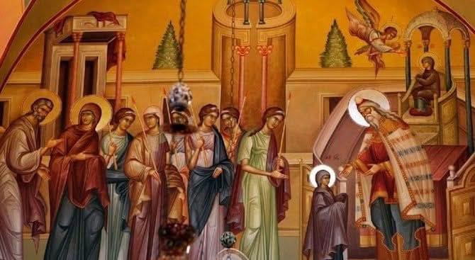 Когато пречистата Дева навършила три години, праведните ѝ родители – Йоаким и Ана – изпълнили обещанието, което дали пред Бога, преди още тя да се роди. Затова те тържествено въвели своята дъщеря в Йерусалимския храм и я посветили на Бога.