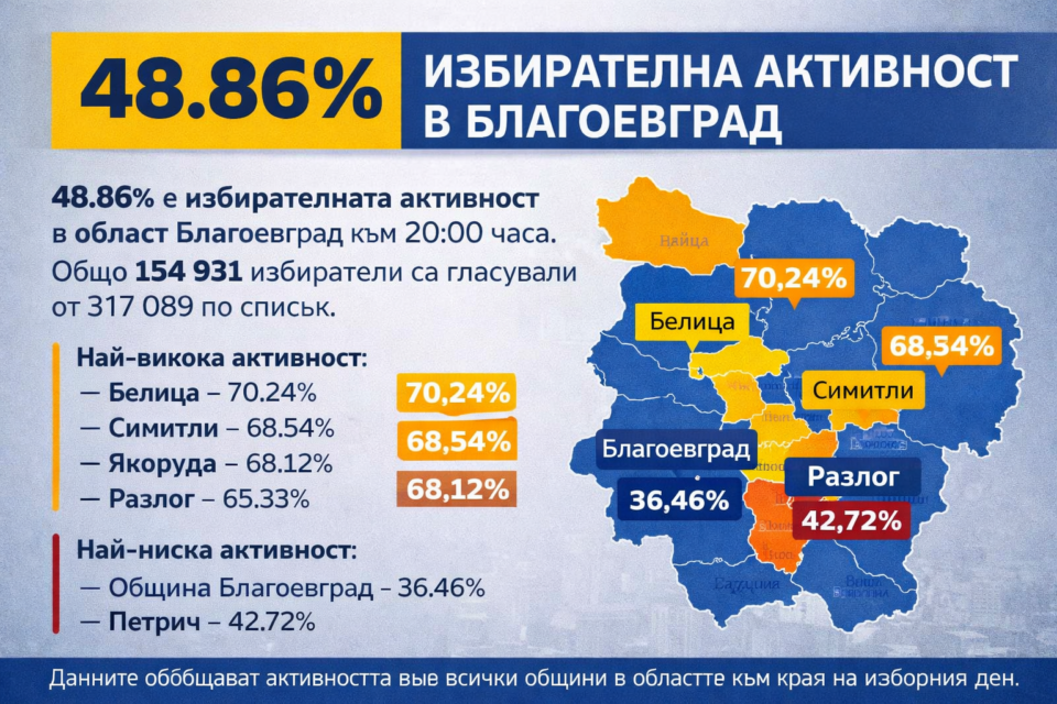 Най-висока активност се отчита в Белица – 70.24%, Симитли – 68.54%, Якоруда – 68.12% и Разлог – 65.33%, докато най-ниска остава в община Благоевград – 36.46% и Петрич – 42.72%.