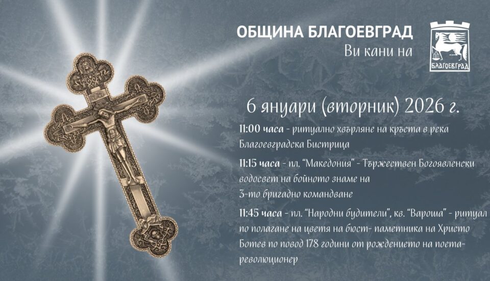 В 11.00 часа на 6 януари, когато отбелязваме църковния празник Св. Богоявление или Йордановден, ще бъде спазена традицията и с потапянето на Богоявленския кръст във водите на река Благоевградска Бистрица. Ритуалът ще се проведе при моста до пл. „Македония“.