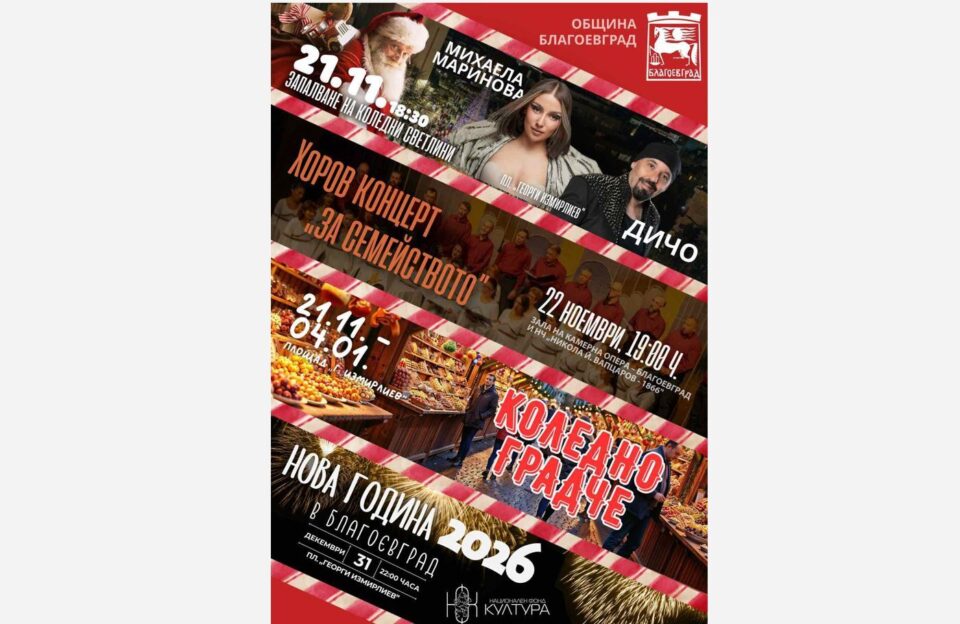 На 21 ноември, в Деня на християнското семейство, Благоевград ще запали коледните светлини. Това ще постави началото на богата програма, включваща концерти и Коледно градче, допринасящи за празничния коледен дух.