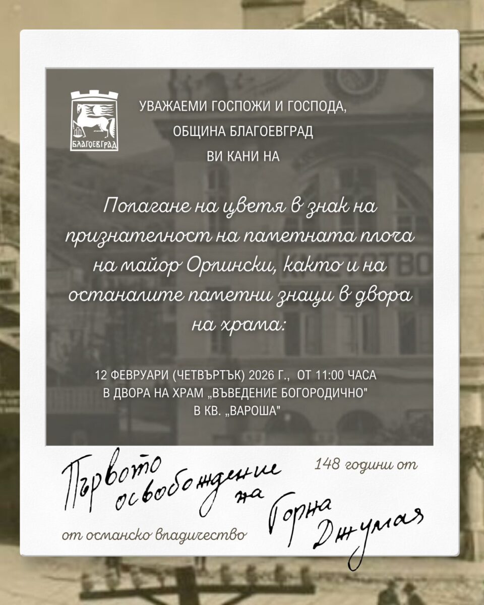 Първото освобождение от османско робство на Горна Джумая ще бъде отбелязано на 12 февруари в Благоевград.