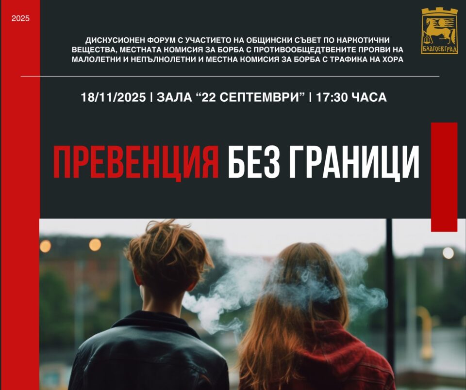 Община Благоевград организира форум „Превенция без граници“, който ще се проведе на 18 ноември от 17:30 ч. в зала „22 септември“.