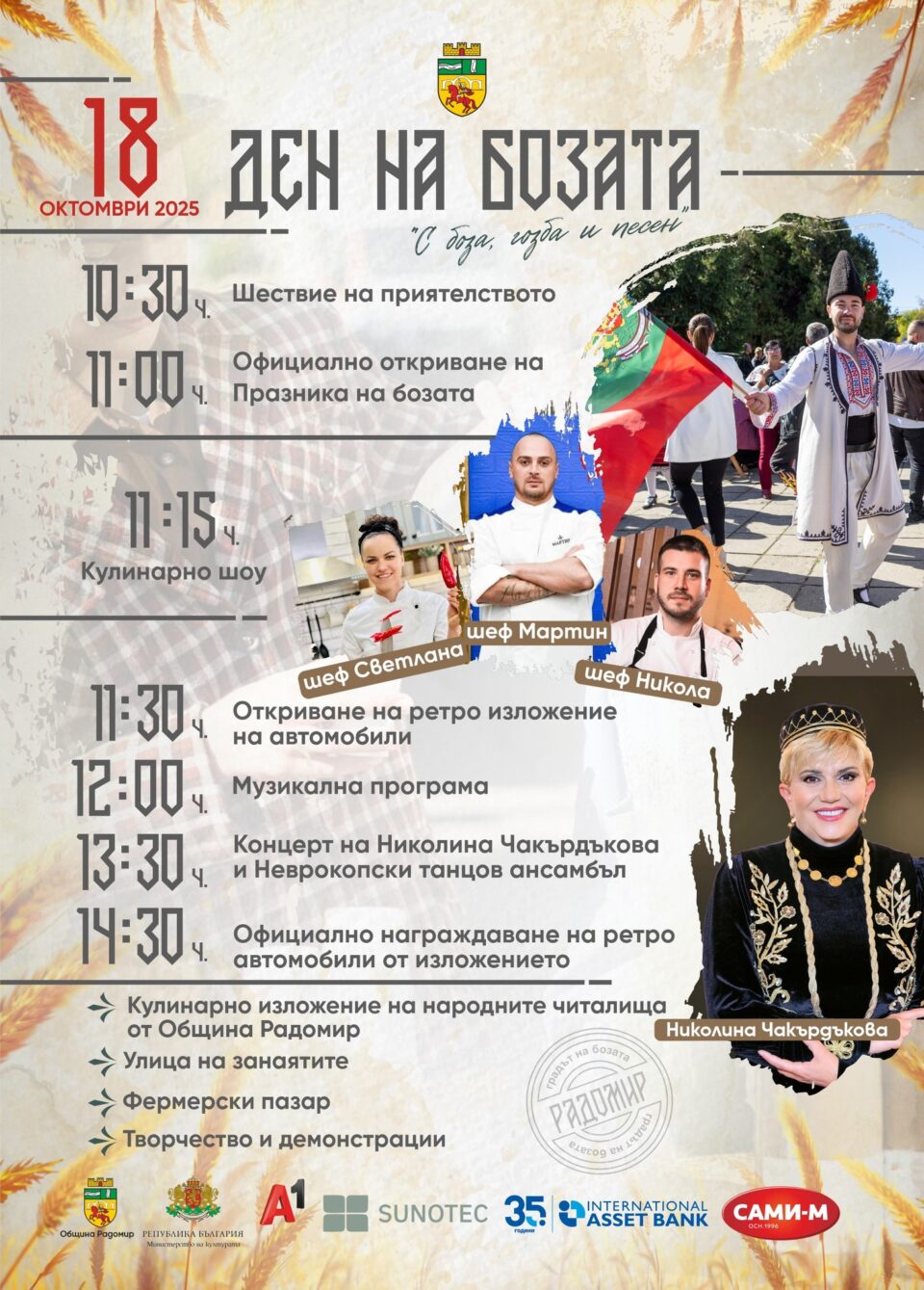 На 18 октомври Радомир отново ще се превърне в столица на традицията, вкуса и доброто настроение с юбилейното издание на Деня на бозата. Събитието обединява в едно вкусове, занаяти и народни традиции през погледа на младите и труда на местните производители и творци.