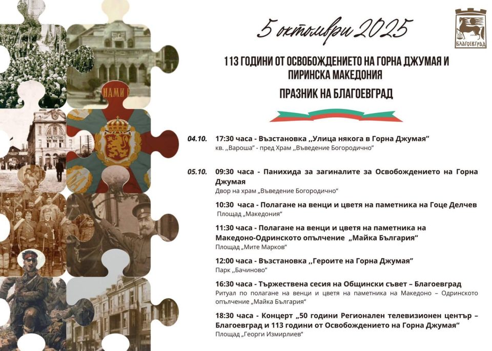 Празничният 5 октомври ще започне в 09:30 часа в двора на храм „Въведение Богородично“ с панихида за загиналите за Освобождението на Горна Джумая.