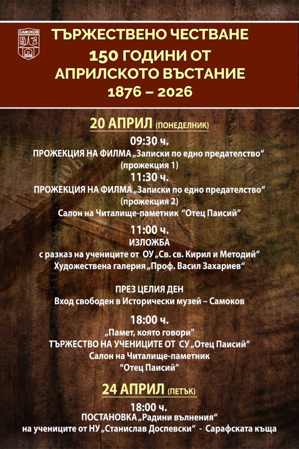 Самоков се включва в чествания, посветени на героизма и саможертвата на българите през 1876 година, като кани жителите и гостите на града да бъдат част от дни на памет, признателност и родолюбие. Подготвена е разнообразна програма, която обединява кино, изкуство, ученически инициативи и театрални постановки.