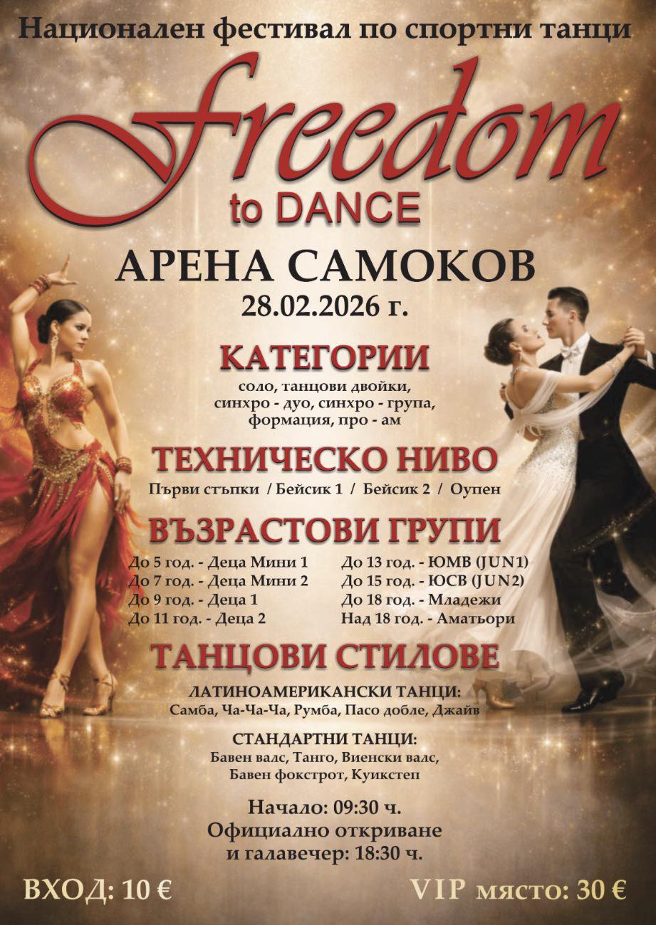 На 28 февруари зала „Арена Самоков“ ще се превърне в сцена на ритъм, емоция и спортен дух, като за първи път ще бъде домакин на Национален фестивал по спортни танци – мащабно събитие с амбицията да се утвърди като дългогодишна традиция в танцовия календар на България.